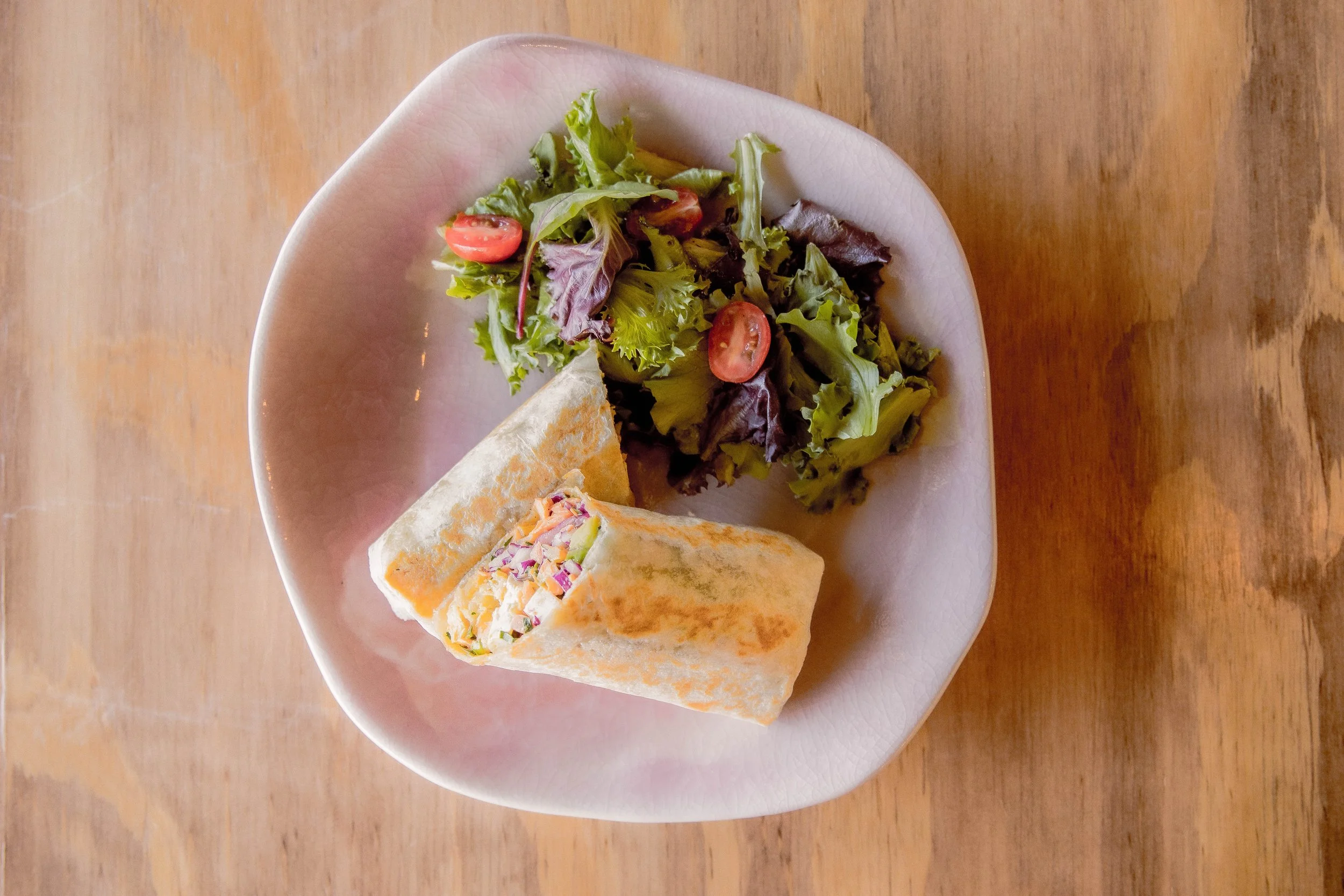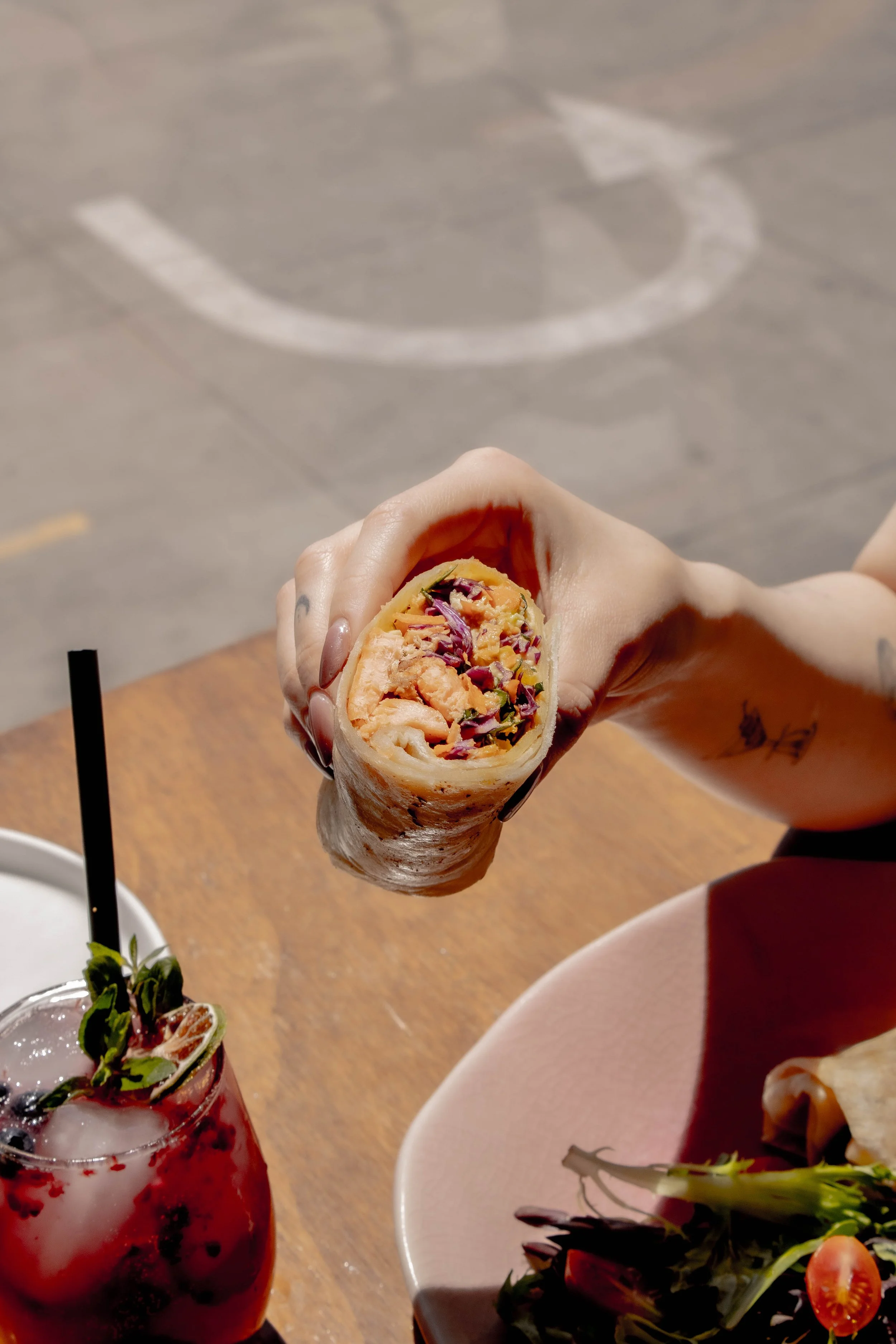 Pollo a la plancha, queso panela, aguacate, zanahoria, pimiento, col morada, espinaca y alioli.