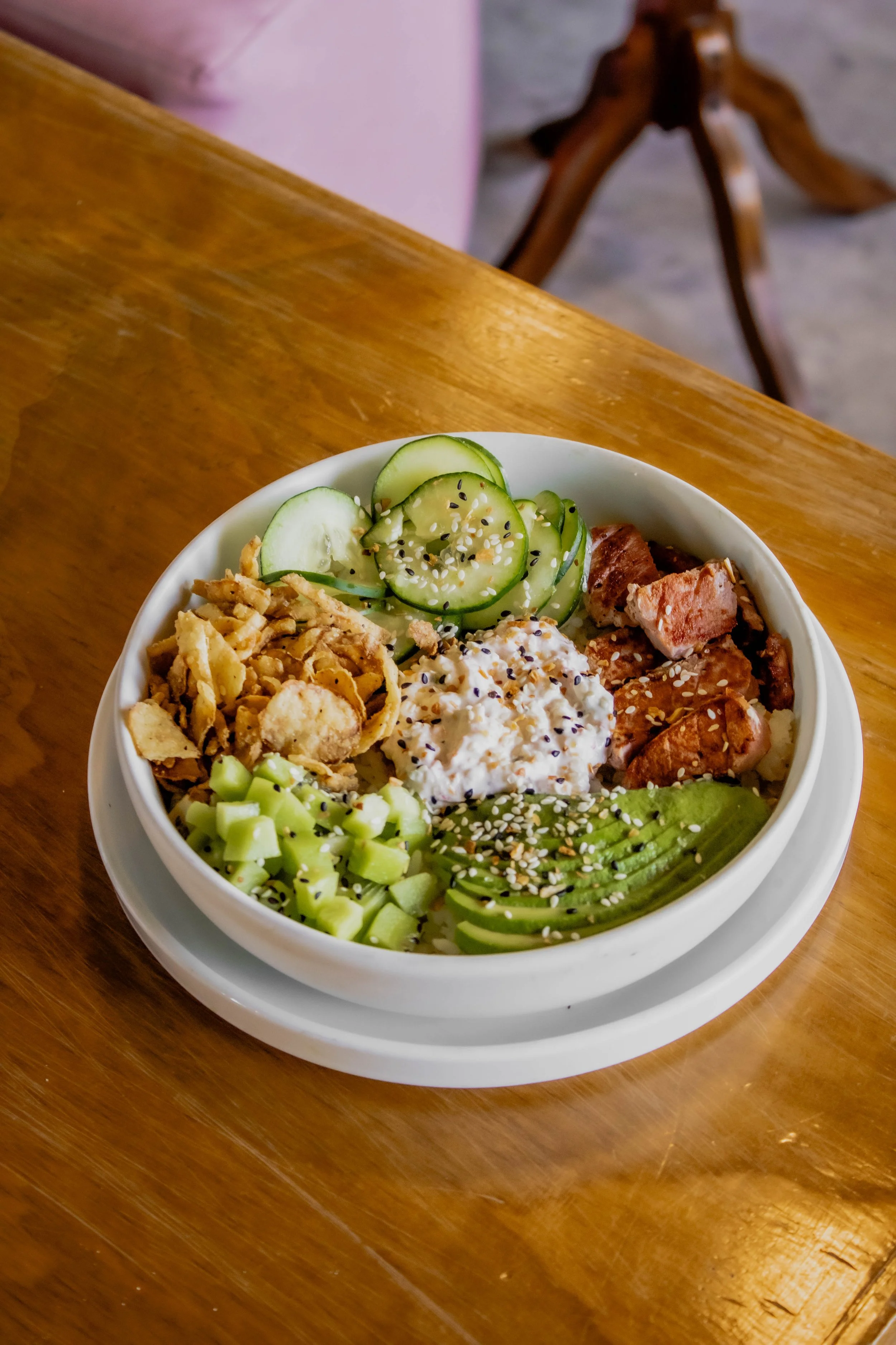 Base de arroz, medallón de atún, aguacate, pepino, cebolla frita, kiwi, alga nori, tampico y un toque de everything bagel. Aderezo a elegir.