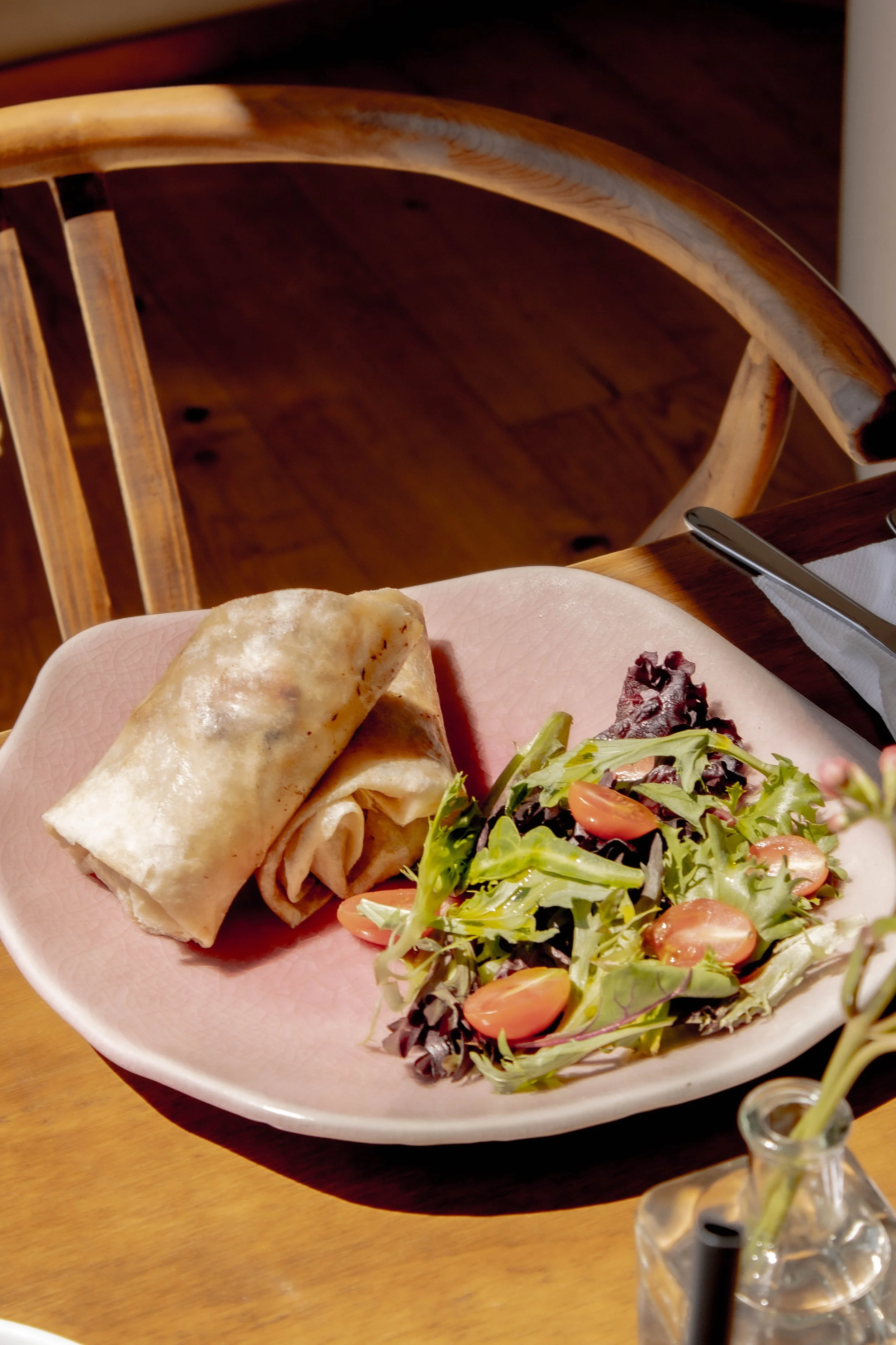 Mix de lechugas, durazno, vinagreta de limón Eureka y miel, queso de cabra, eneldo, pistache troceado y jamón serrano.